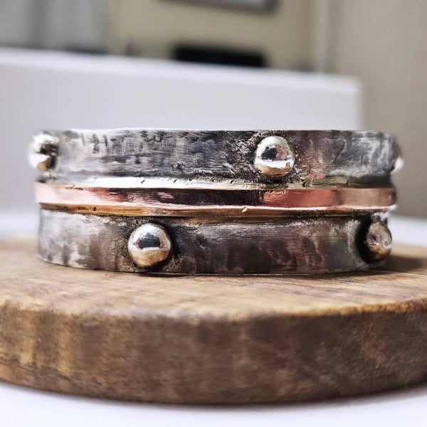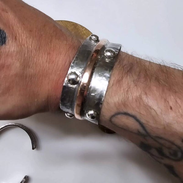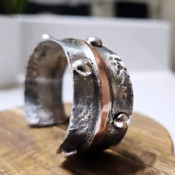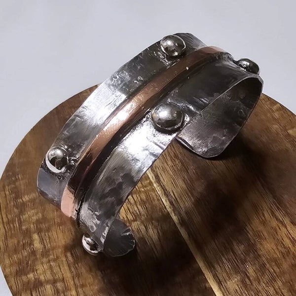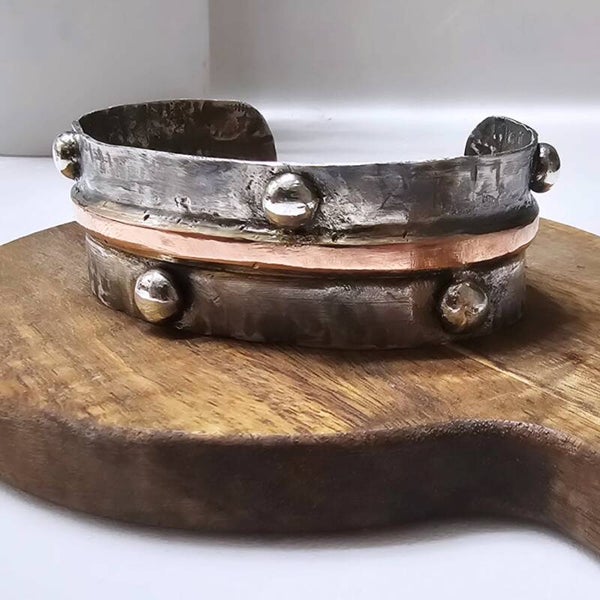 Fine silver .999 with fine copper .999 forged together. The silver studs are solid fine silver, it's textured and antiqued. It has plenty of flex due to the nature of fine silver being softer than sterling silver. Fits wrists size 7-7.5