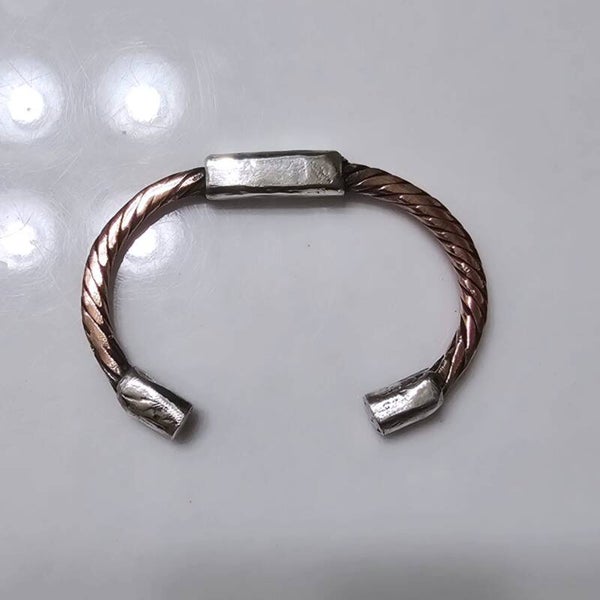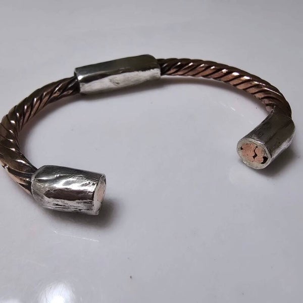 Solid braided copper and fine silver forged together and hammered into shape. Hand finished with files, polished by hand.