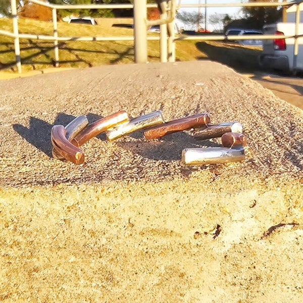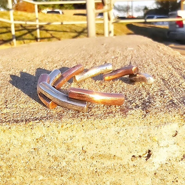 Sterling silver and fine copper, forged and fused together. Each segment is 1/4" (0.25) very robust and sturdy cuff. Total width is approximately 3/4" (0.75) and length is 5" with 1.25" gap for a total size of 6.25