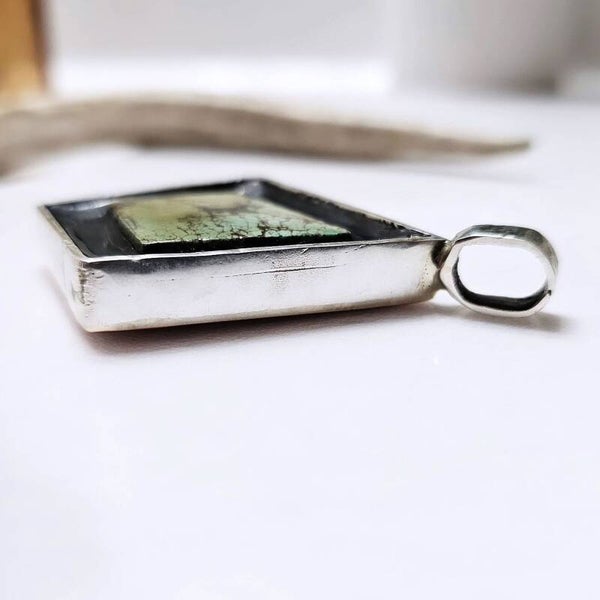 999 fine silver backed with 999 copper. Hand cut and shaped stone. Everything was forged by hand.Large and heavy pendant. Beautiful geometry