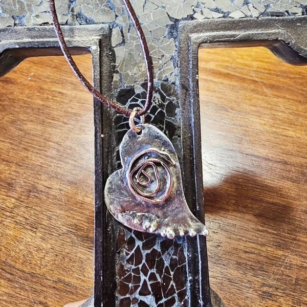 Fine silver and fine copper forged together to create this rustic hand crafted heart. Antiqued finish with touches of high polish.
