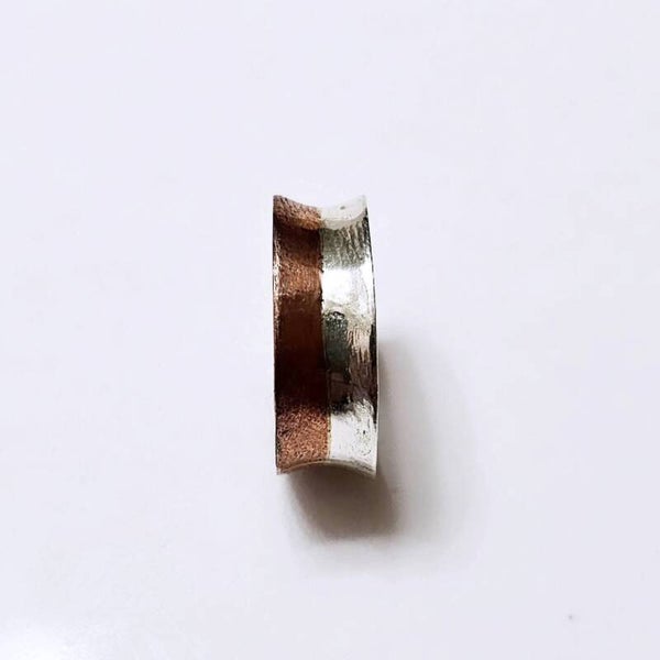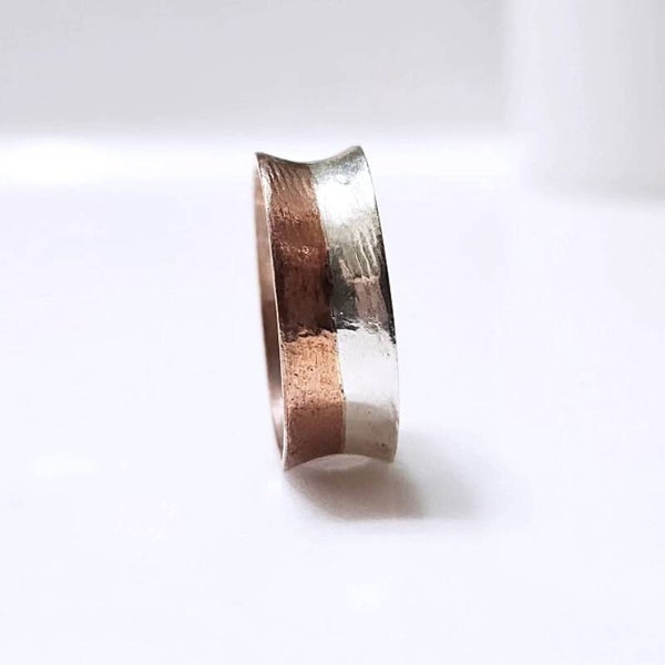 Bullion minted .999 fine silver forged with .999 pure copper. Hammered and forged on an anvil and high heat. Hammered into a concave band.Size 11.5