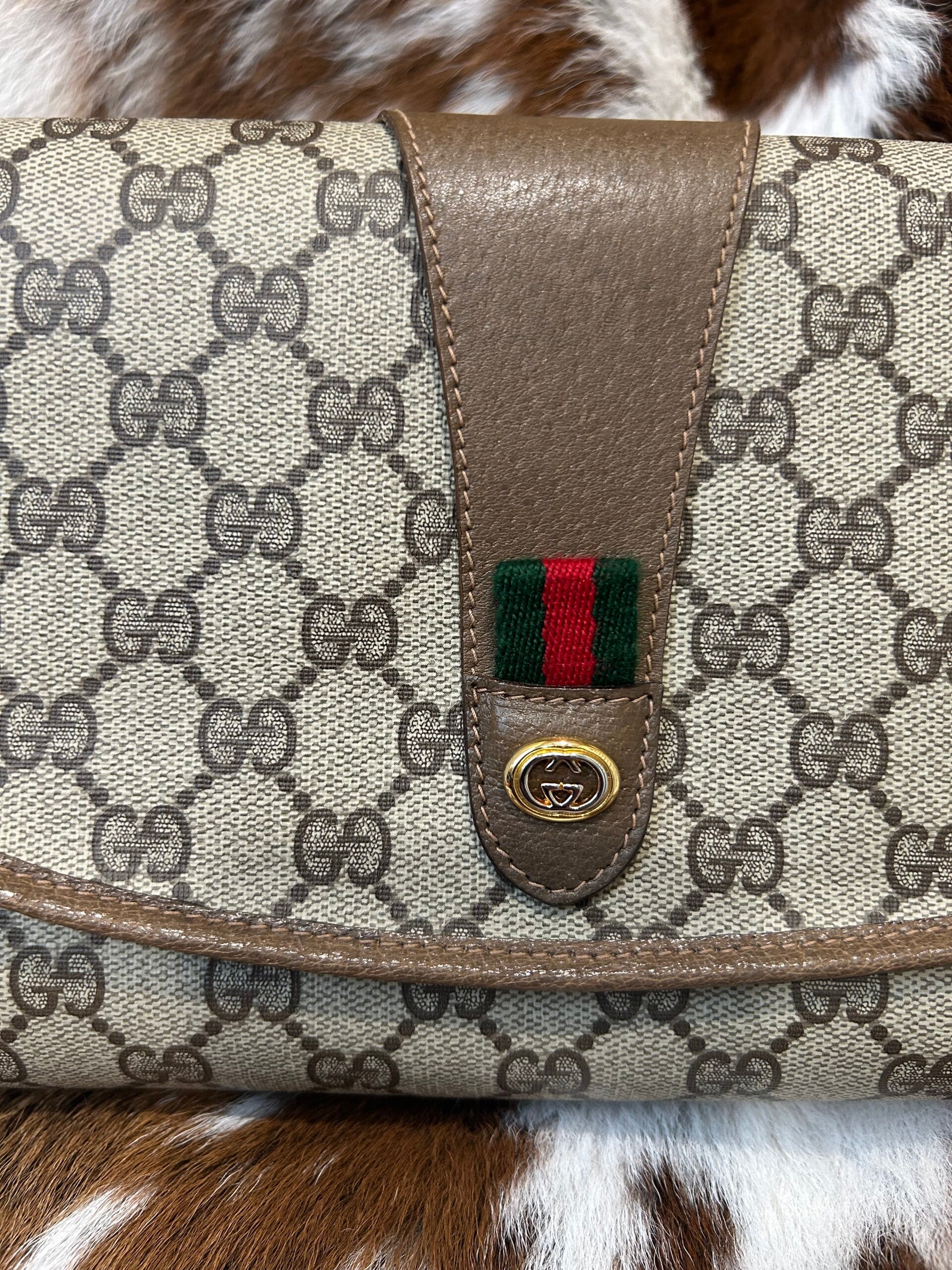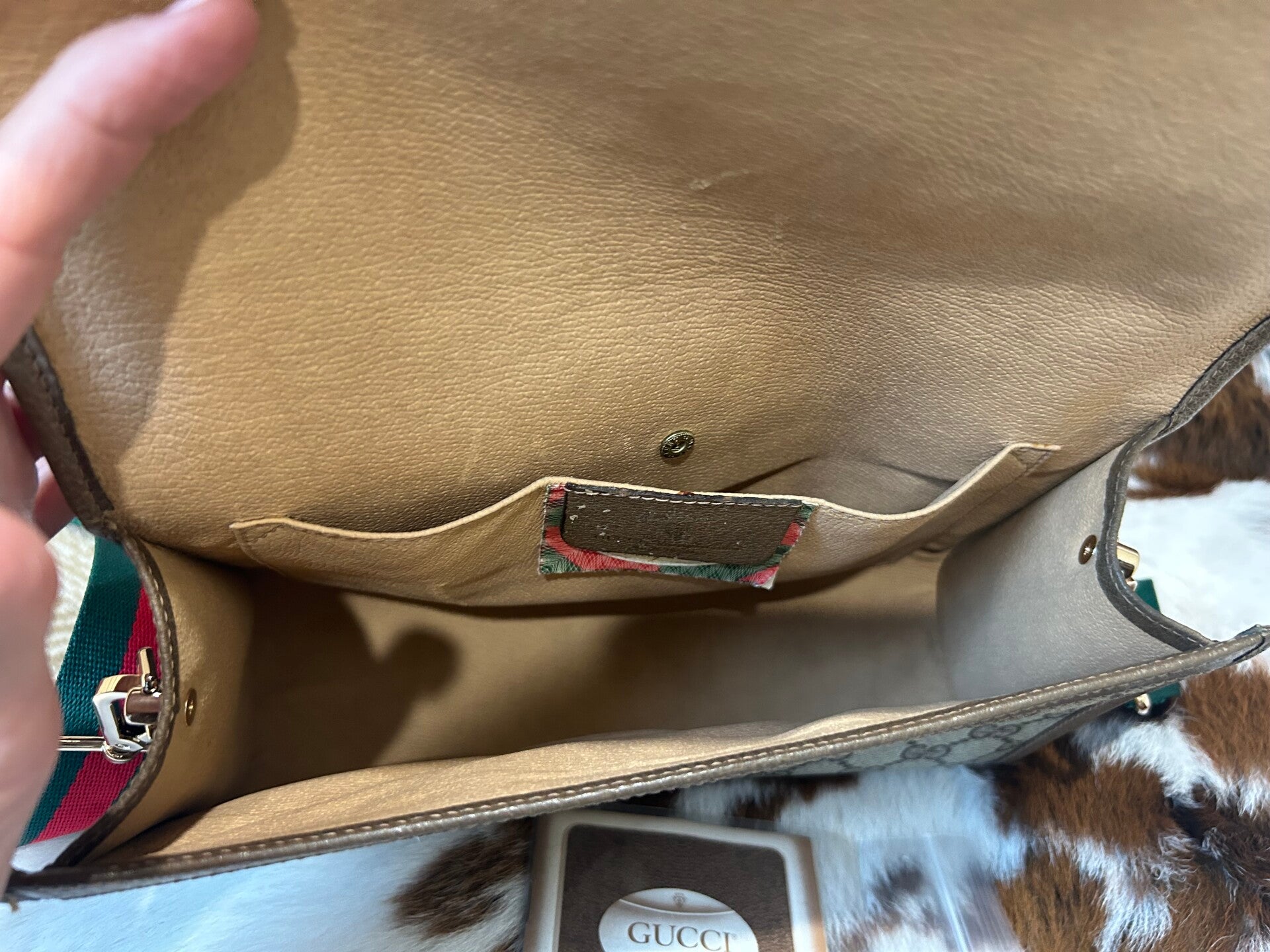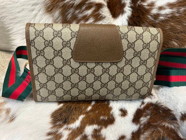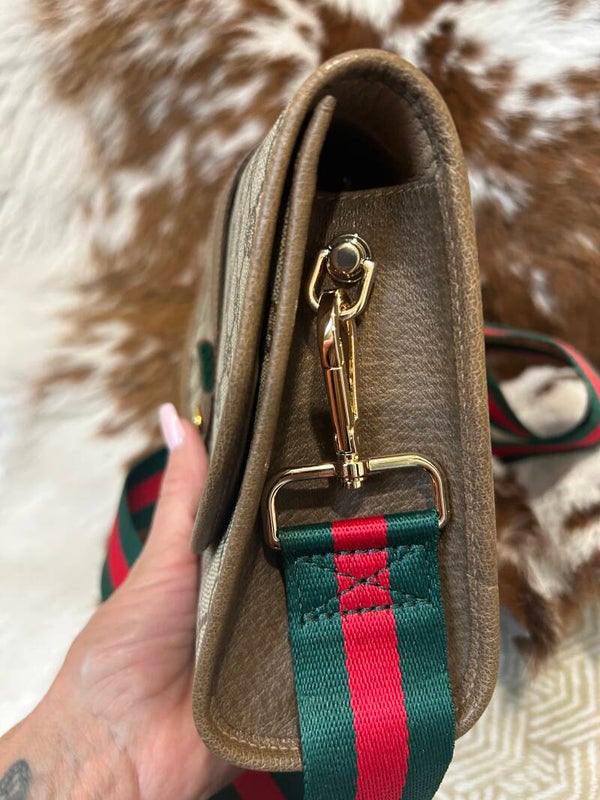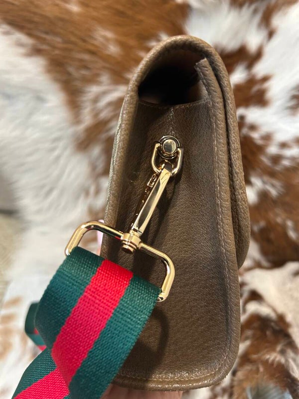 Really cute functional Authentic Gucci crossbody . we added non-Gucci hardware to the end of each side of the bag so we could turn it into a cross body. You can also still use as a clutch.. Strap is not authentic. It is green and red and adjustable.