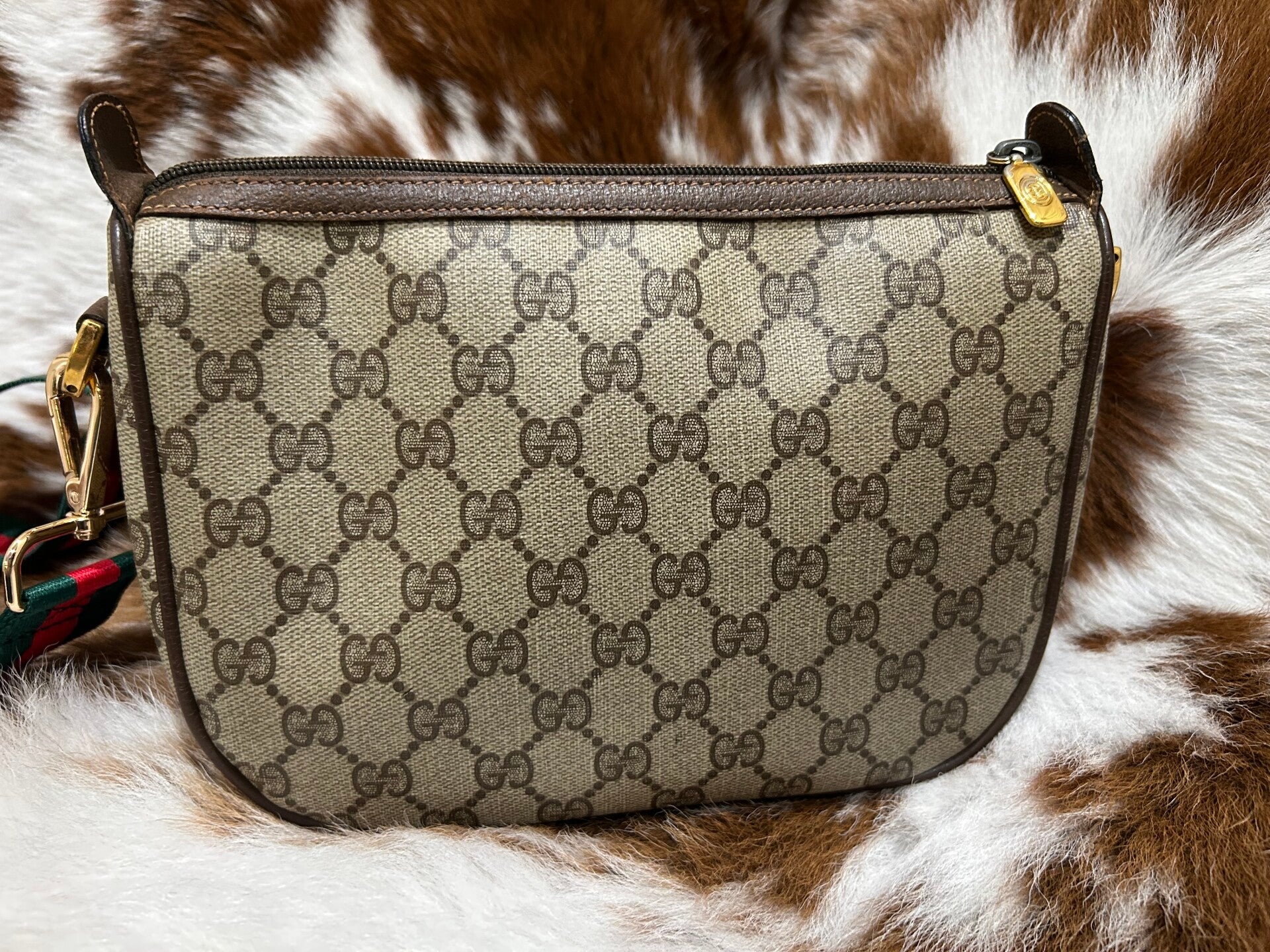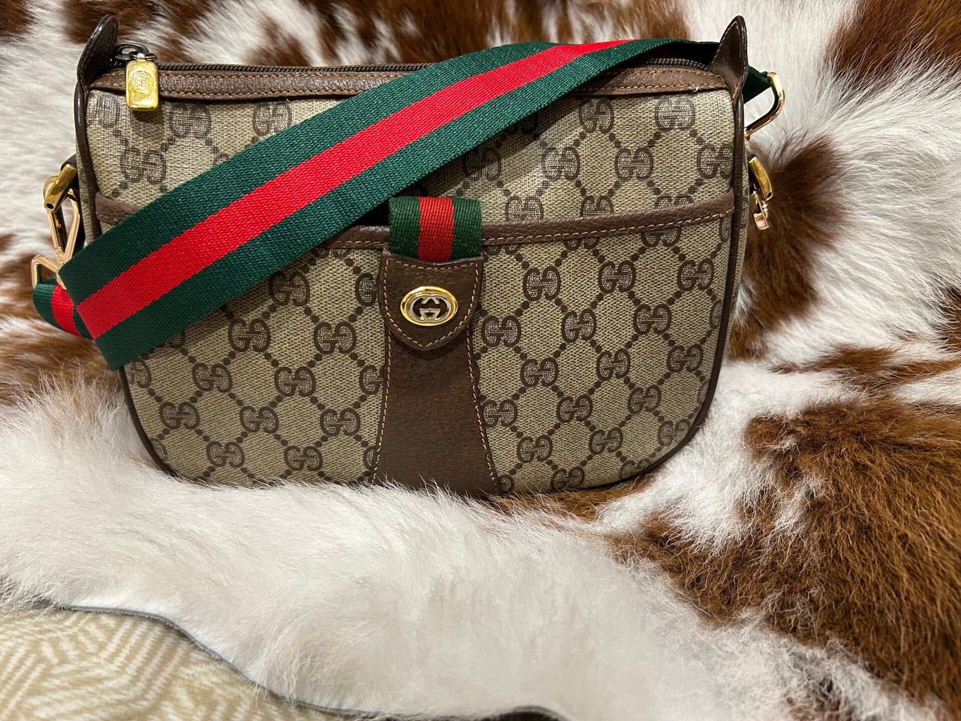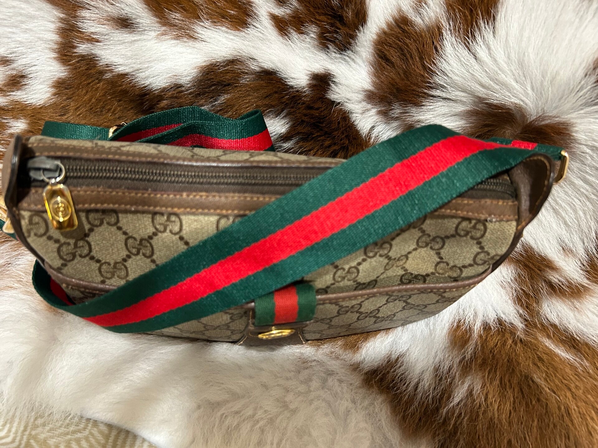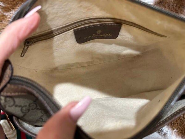 Gorgeous Gucci crossbody bag , with non Gucci green and red canvas adjustable strap.
